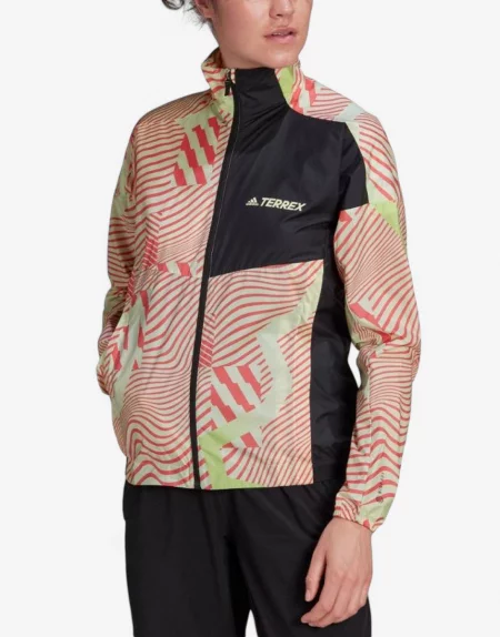 Дамско ветроустойчиво яке Adidas Terrex в сив цвят с черни акценти, изработено от висококачествена материя. Със стандартна кройка, пълно закопчаване с
