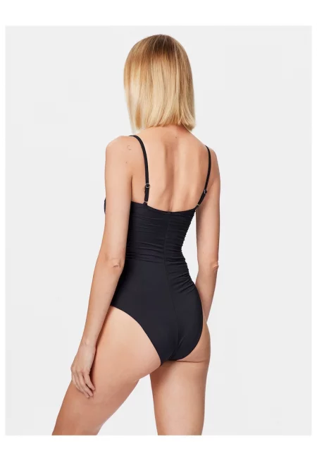 Основни детайли Тип продукт: бански 2 части Цвят: сиво-кафяв Принт: без принт Форма чашка: бюстие Материал: синтетичен Закопчаване: връв Дизайн Тип сутиен: неподплатен Банели: без банел Стил деколте: v Тип долнище: бразилско Състав на материала Външна част: 80% полиамид ...