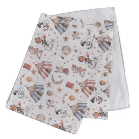 Памучна бебешка пелена в бяло и жълто, с красиво бродирано слонче, с кант в същата цветова гама. Удобно и практично моделче. Размер: 90x90см. Състав: 100% памук.