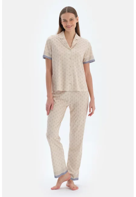 Характеристики Тип продукт: горна част на пижама Цвят: каки Принт: без принт Материал: памук Деколте: шпиц Дължина ръкав: къс ръкав Закопчаване: копчета Състав Външна част: 100% памук