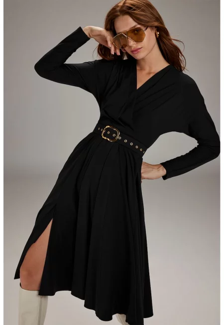Разкроена рокля с шпиц и колан - Черен