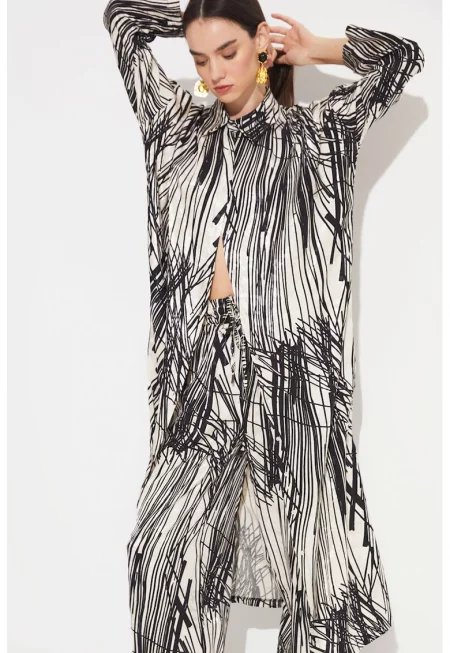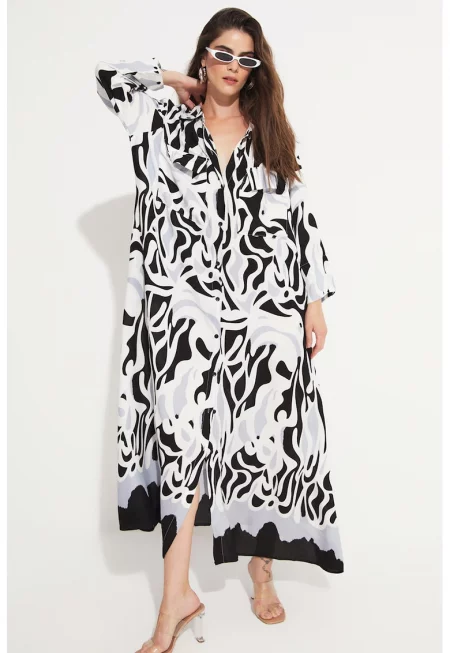 Голяма рокля тип риза с принт и джобове - Черен/Светло сив/Бял