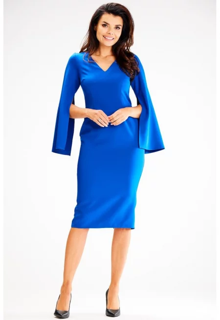 Миди рокля с дълъг ръкав - вталена А596 - Син
