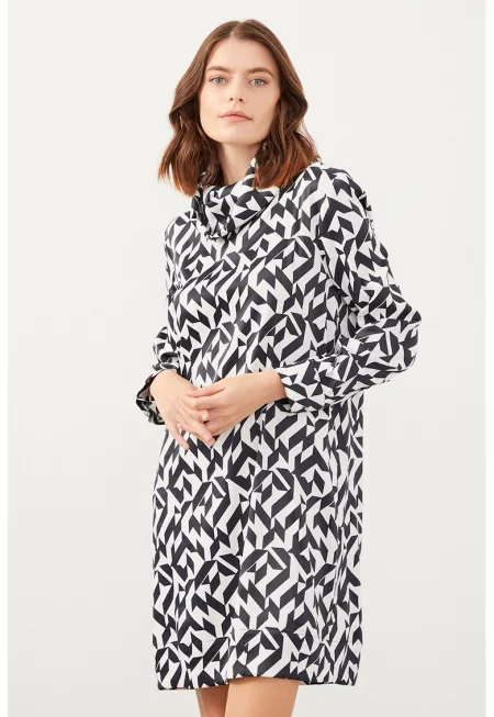 Десенирана рокля с класческа яка - Бял/Черен
