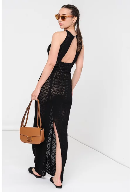 Фино плетена дълга рокля с цепка на гърба - Черен