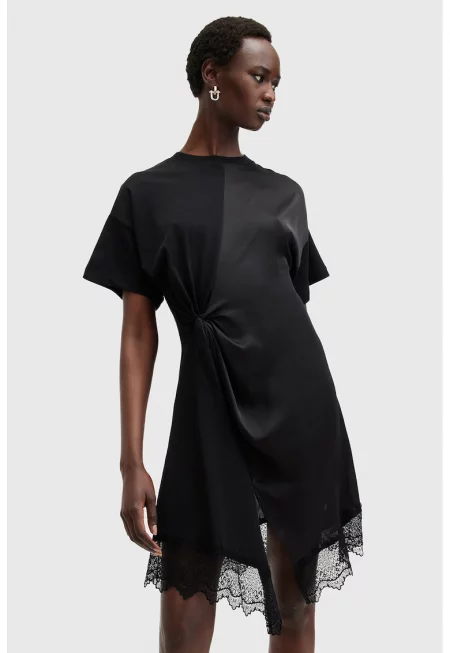 Къса рокля с къси ръкави и дантелен подгъв - Черен
