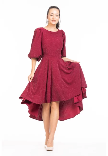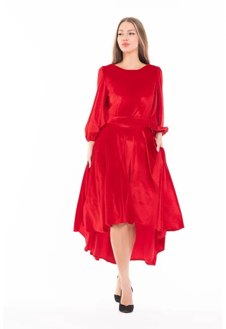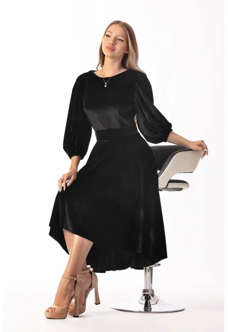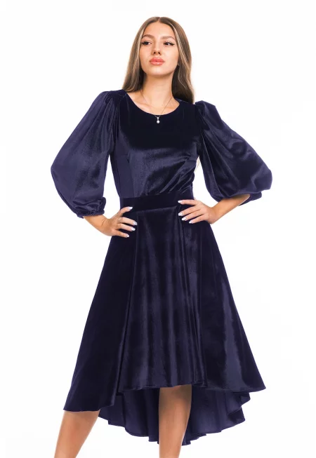 Кадифена асиметрична рокля с бухнали ръкави