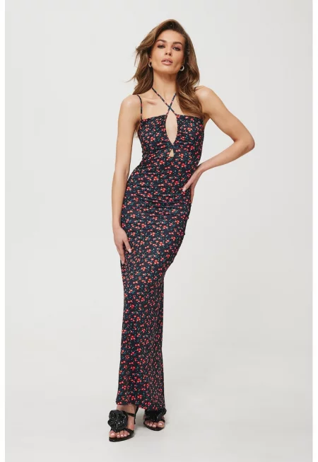 Дамска макси рокля с щампа и връзка на врата - полиестер - черна