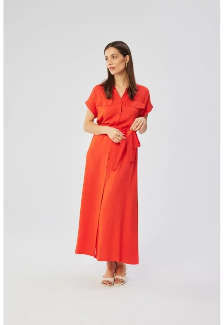 Дамска рокля - с висока яка и връзка на талията - полиестер - оранжева