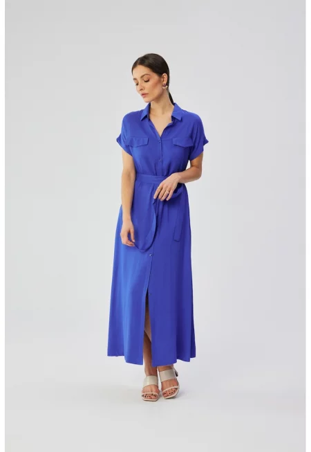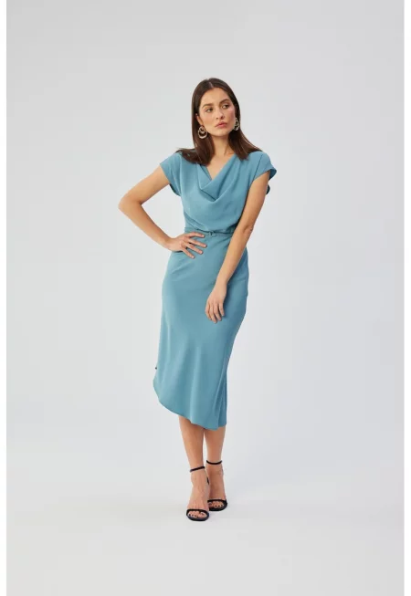 Дамска рокля - с висока яка и връзка на талията - полиестер - син