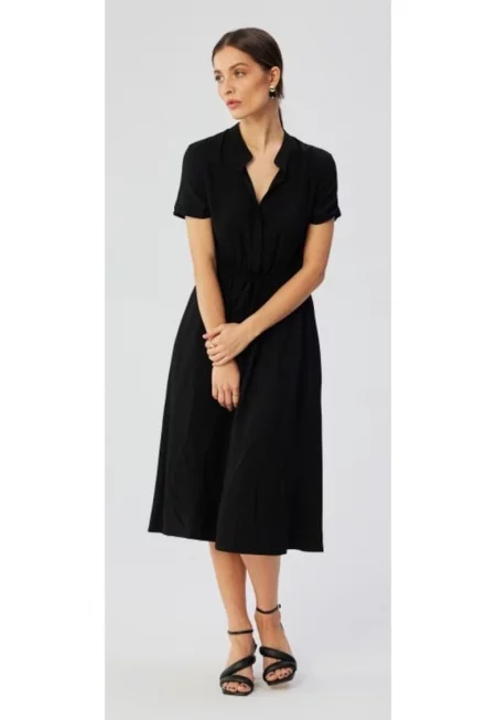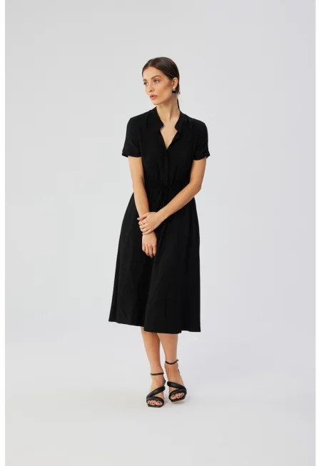Дамска рокля - с гумен колан и връзка на гърба - Полиестер - Черна - М