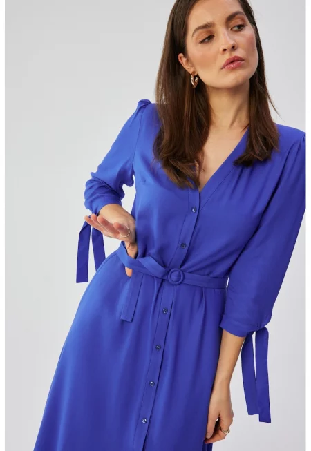Дамска рокля - миди с вързани маншети - полиестер - синя
