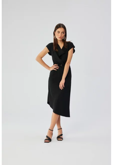 Дамска рокля - асиметрична с каскадно деколте - полиестер - черна