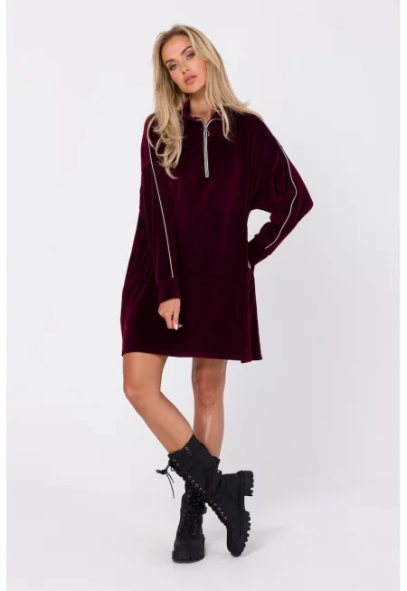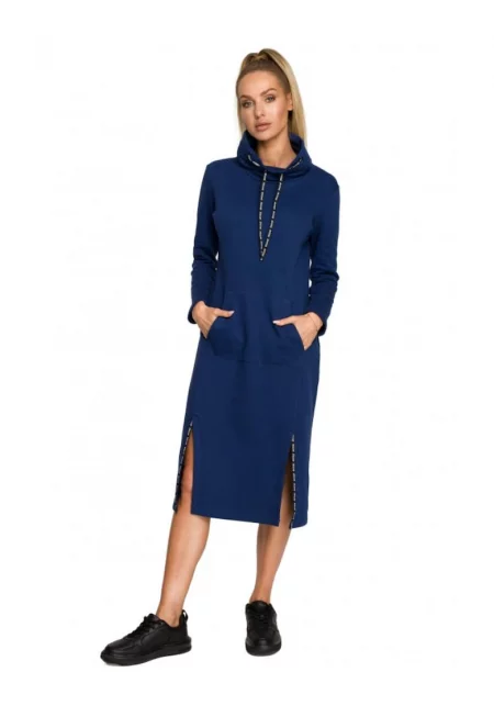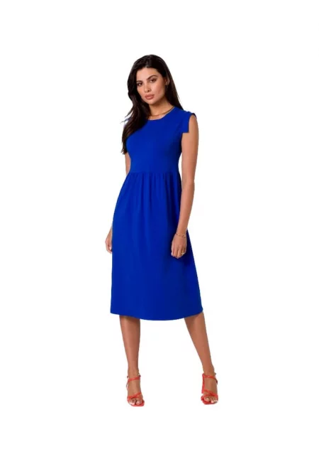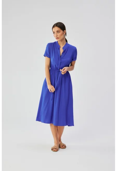 Дамска рокля - с висока яка и връзка на талията - полиестер - син