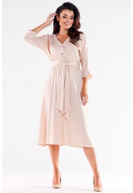 Бежова миди рокля с три четвърти ръкави A522