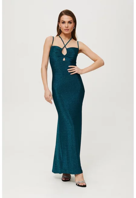 Дамска рокля - метална макси с вратовръзка - полиестер - синьо
