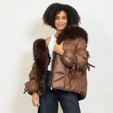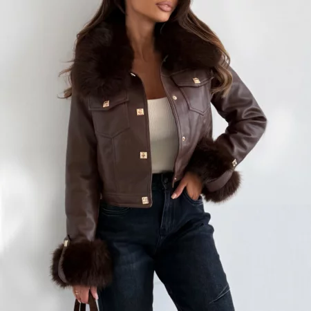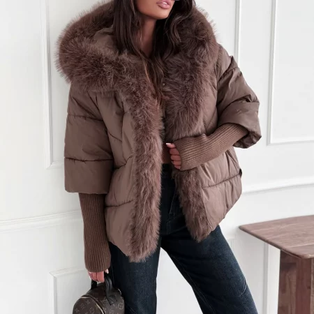 Стилно дамско яке, еко кожа , цвят кафяв с кафяв пух, Ft8595-1