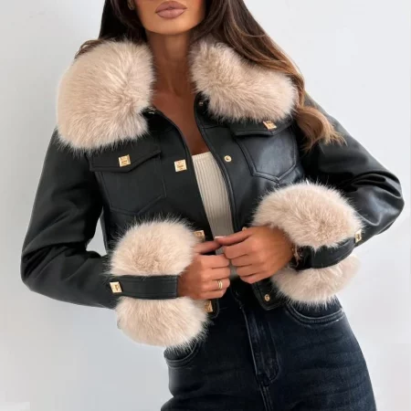 Стилно дамско яке, еко кожа , цвят черен с бежов пух, Ft8594