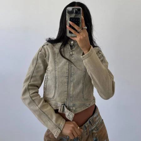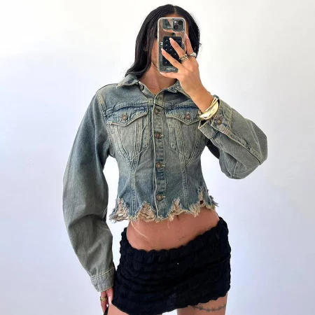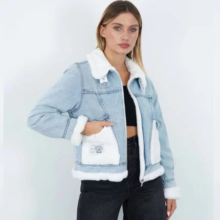 Дамски дънково яке, накъсан захабен ефект, цвят син, Ft8577