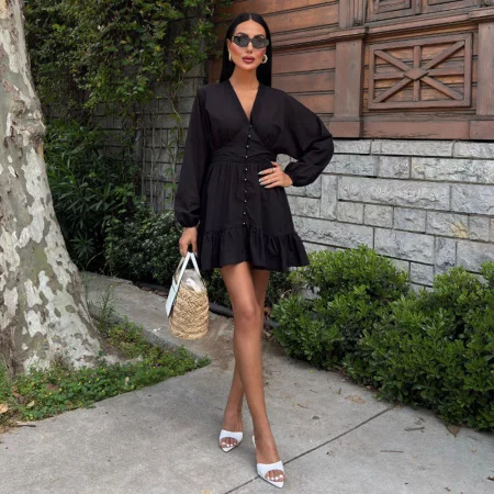 Бродирана рокля с раирана пола и волани, цвят черен, Ft8461
