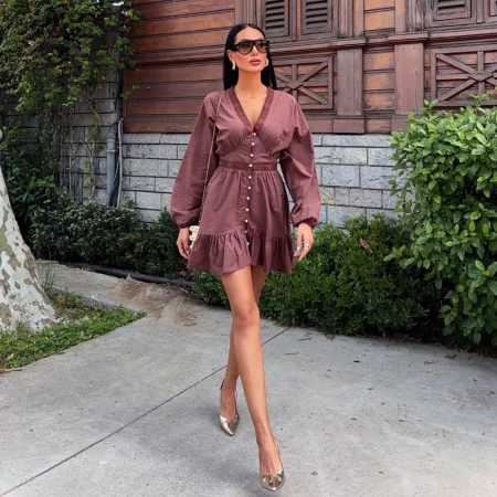 Бродирана рокля с раирана пола и волани, цвят кафяв, Ft8460