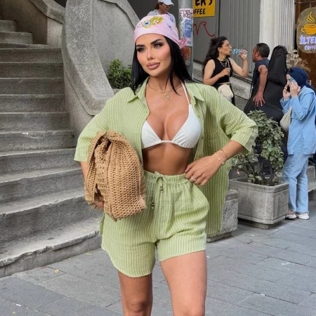Kомплект, сет риза с къс панталон, цвят зелен райе, Ft8492