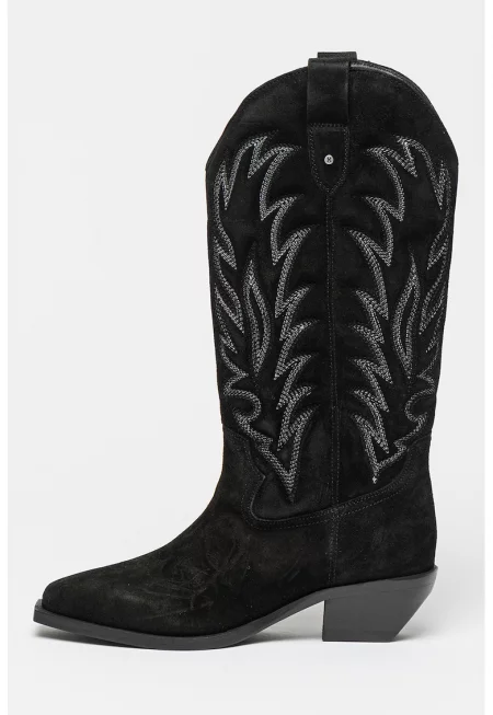 Велурени ботуши с бродерия - Тъмнокафяв