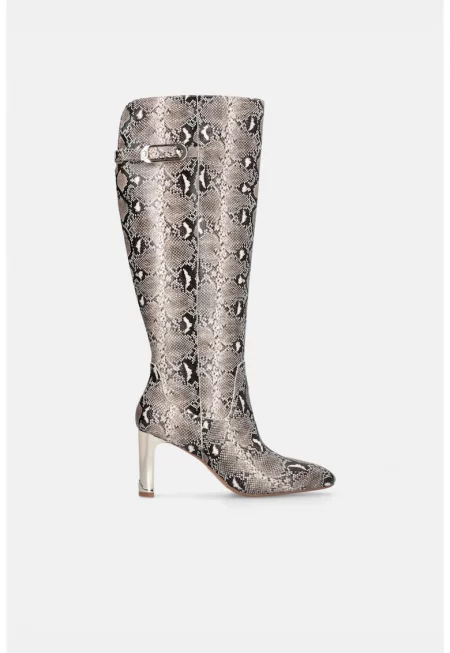 Ботуши от еко кожа до коляното със змийска шарка - Черен/Бежов