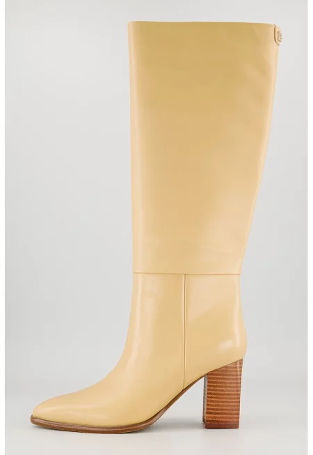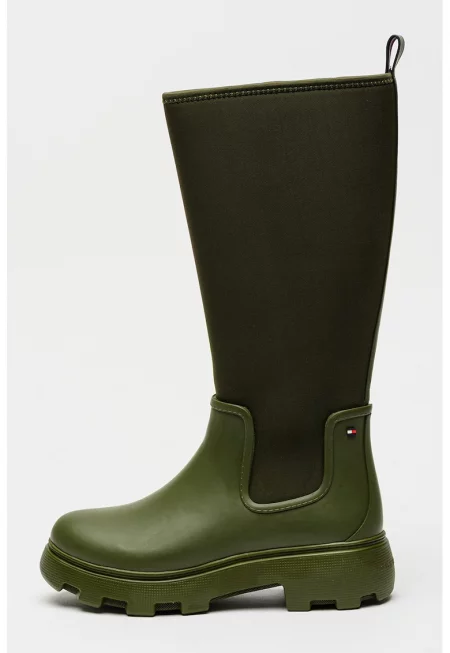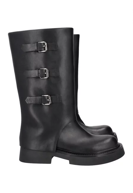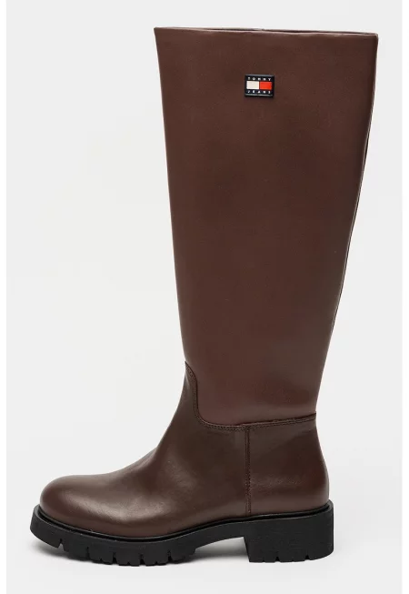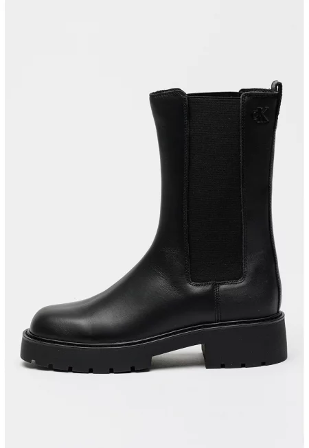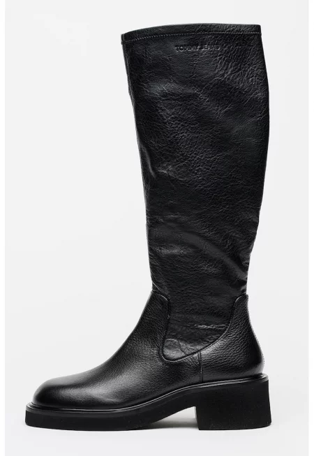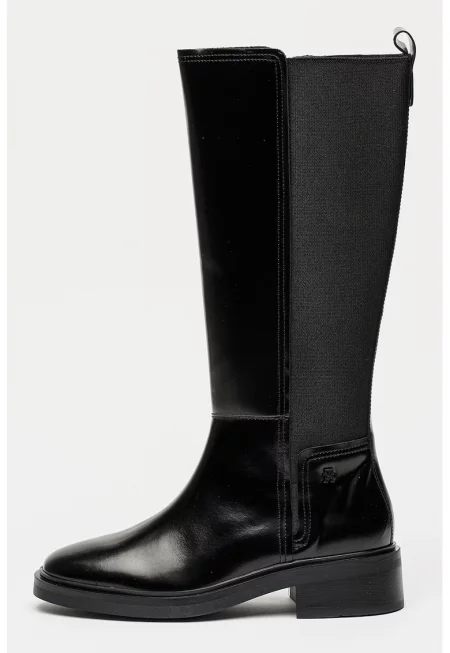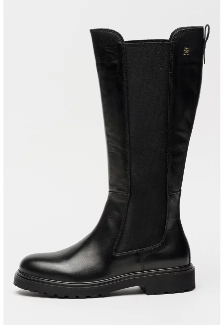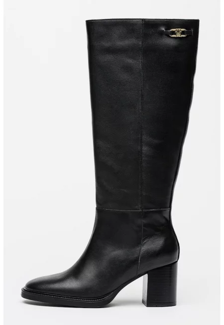 Кожени високи ботуши с квадратен връх и лого - Черен