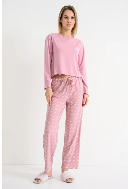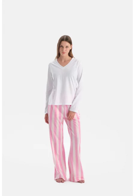 Дълга шпиц пижама от памук на райе - Бял - Розово -