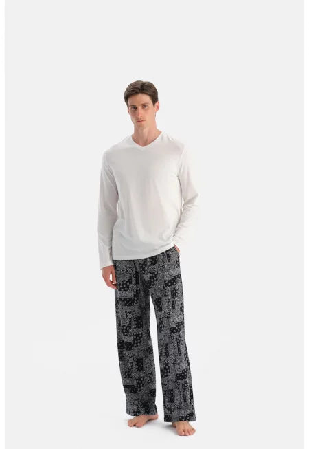 Дълга памучна пижама с графична шарка - Бял - Тъмносин -