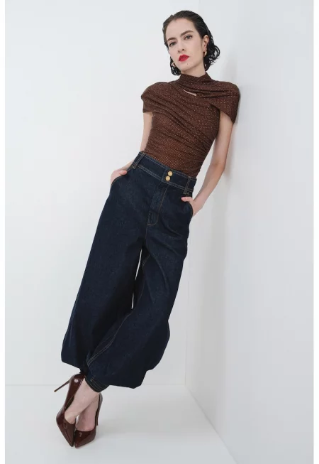 Блуза с набрани къси ръкави и декоративни камъни