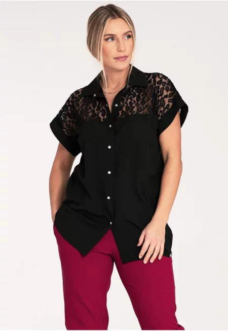 Дамска риза ажурна - черна - къс ръкав - дантела - 80% полиестер