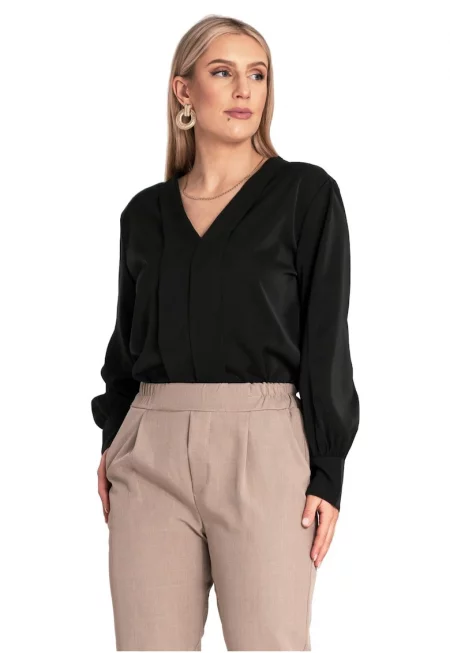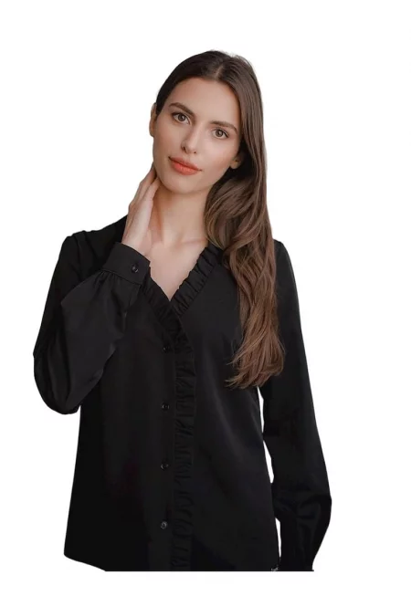 Дамска риза полиестер - дълъг ръкав - V-образно деколте - черна - SM