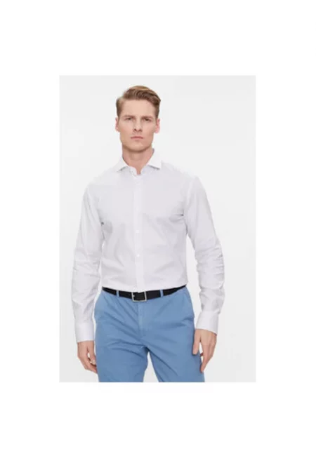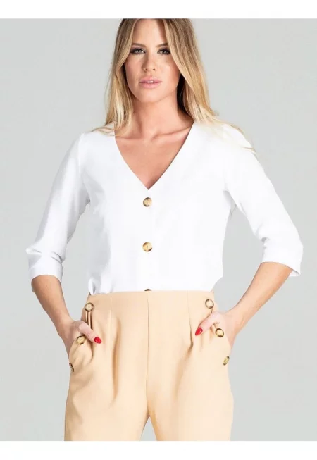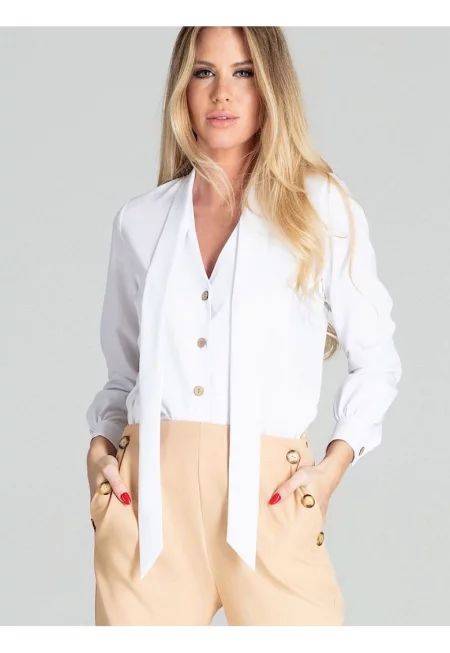 Дамска риза бяла с деколте и декоративен колан от полиестер.