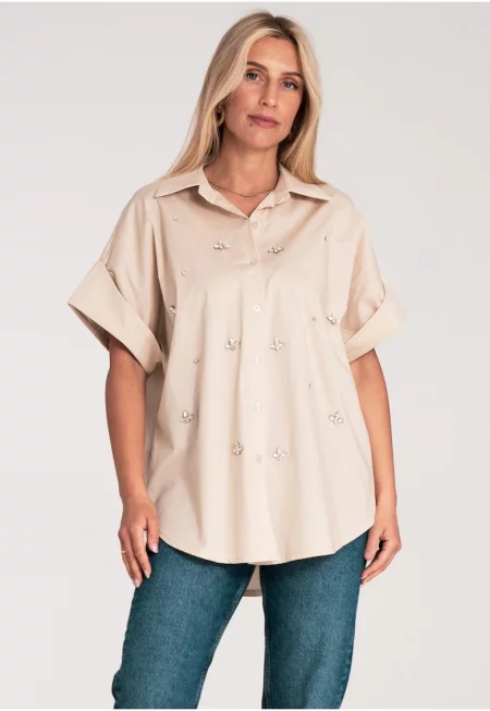 Оувърсайз риза бежова - с декоративни апликации - памук - къс ръкав - SM