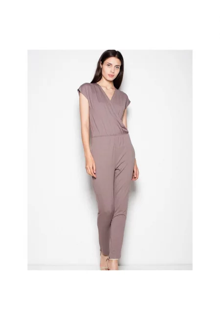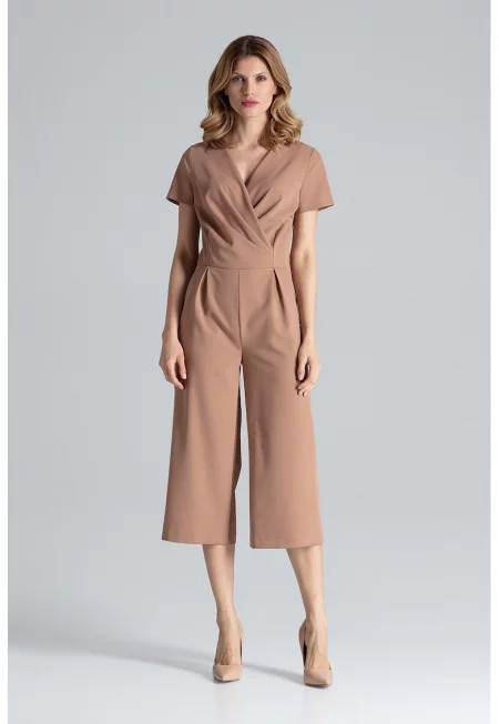 Дамски гащеризон къс ръкав - ефектно деколте - кафяв - вискоза