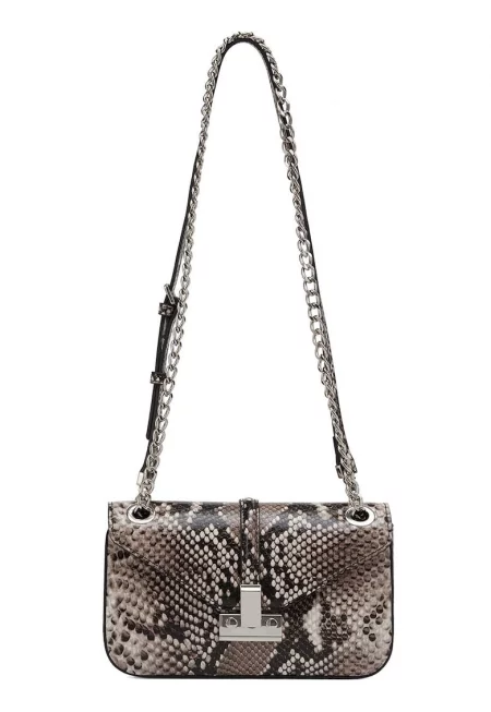 Характеристики Цвят: златист - черен Материал: екологична кожа Модел: чанта през рамо Стил: ежедневен Принт: лого Презрамки: една с верижка Джобове: вътрешни Цвят на метала: златист Закопчаване: цип Детайли: монограм Състав Външна част: полиуретан Подплата: полиестер ...