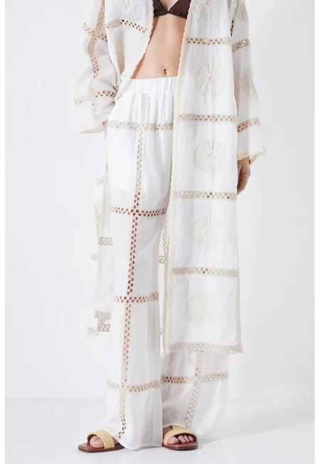 Характеристики Цвят: бял Стил: ежедневен Материал: памук - вискоза Принт: без принт Кройка: свободна Дължина: къси Талия: висока Детайли: еластичен елемент на гърба Джобове: странични Закопчаване: цип - копчета Състав Външна част: 51% вискоза - 42% памук - 7% лен