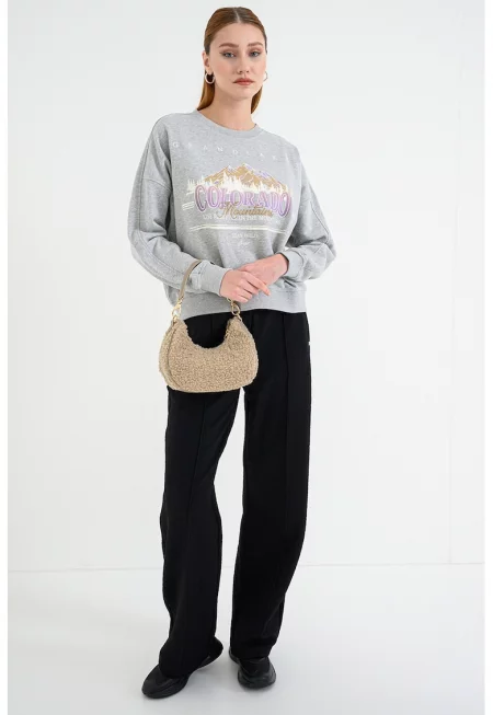 Характеристики Тип продукт: блузон Цвят: светлосив меланж Принт: текст Кройка: над глезена Закопчаване: без закопчаване Материал: полиестер - памук Дължина ръкав: дълъг ръкав Състав Външна част: 56% полиестер - 44% памук