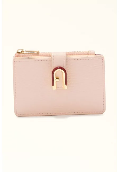 Характеристики Цвят: бледо розово Материал: естествена кожа Принт: без принт Джобове: вътрешен Детайли: метално лого Закопчаване: капси Състав Външна част: 100% кожа Подплата: 100% вискоза Размери Размери (см): 7x9x3