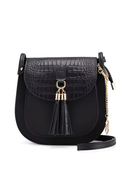 Характеристики Цвят: черен Материал: eстествена кожа Модел: за рамо Стил: ежедневен Принт: без принт Дръжка: една - фиксирана Презрамки: регулируеми - отделящи се Джобове: вътрешен Закопчаване: капаче Състав Външна част: 100% кожа Размери Размери (см): 10.5x22x6