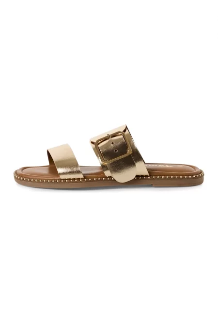 Характеристики Тип: чехли Цвят: сиво-кафяв Стил: ежедневен Материал: естествена кожа Връх: кръгъл Тип на подметката: плоска Детайли: златисти капси - апликация от плетена юта на подметката Закопчаване: без закопчаване Състав Горна част: кожа Материал интериор: други ...