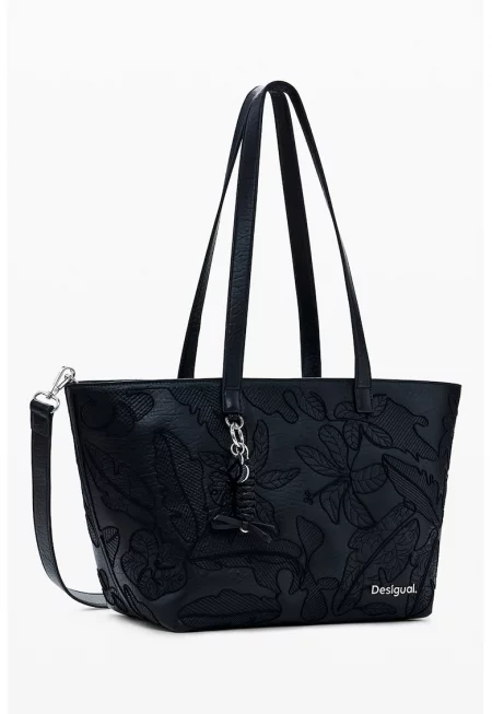 Характеристики Цвят: черен Материал: екологична кожа Модел: чанта през рамо Стил: ежедневен Принт: с принт Дръжка: две Презрамки: отделящи се Отделения: основно Цвят на метала: златист Закопчаване: цип Състав Външна част: полиуретан Размери Размери (см): 26x25x14