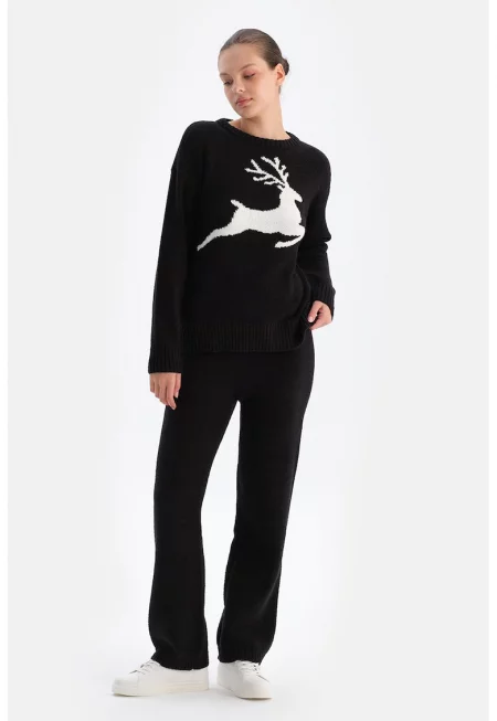 Пуловер с принт на еленче - Бял - Черен -