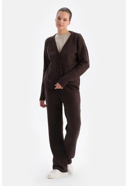 Плетен панталон с еластична талия - Тъмнокафяв -