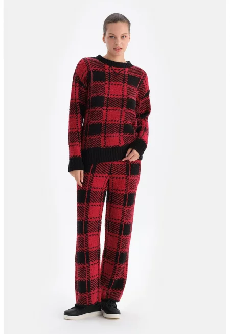 Плетен кариран панталон - Червен - Черен -