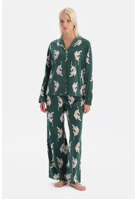 Горна пижама с копчета и принт - Зелен - Слонова кост -