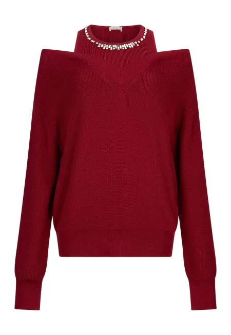 Пуловер с вълна с отвори на раменете - Тъмночервен