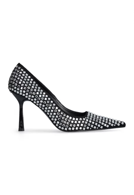 Остри обувки с декоративни камъни - Черен/Сребрист